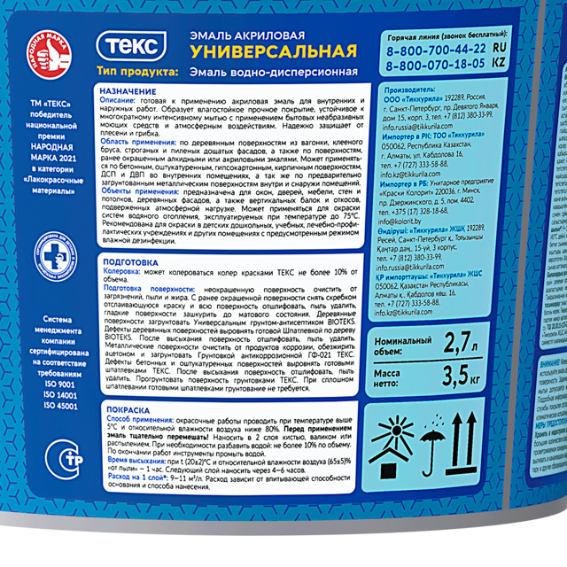 эмаль акриловая универсальная ТЕКС база D 2,7л бесцветная, арт.700011389