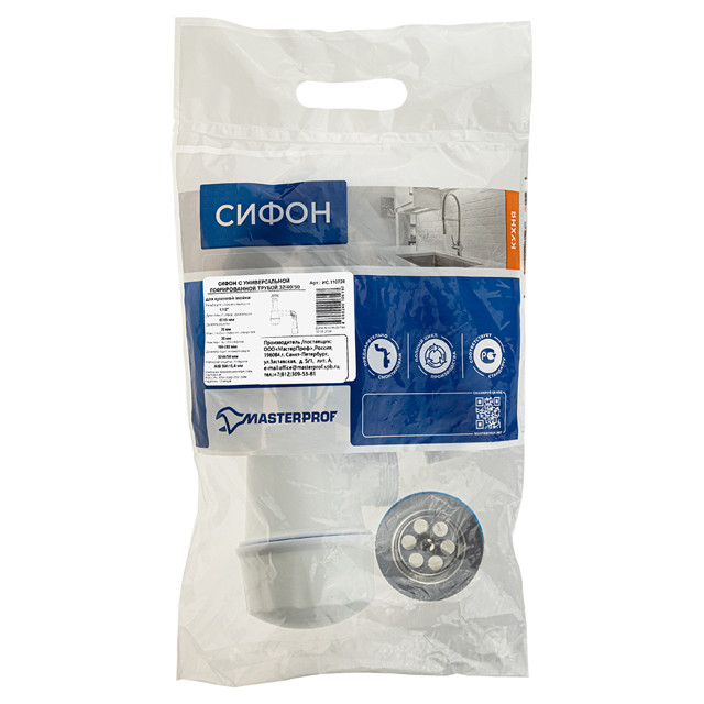 сифон для мойки MasterProf 1.1/2"х40 со смещением с/без отвод стир. маш. с гибкой трубой 40х32/40/50